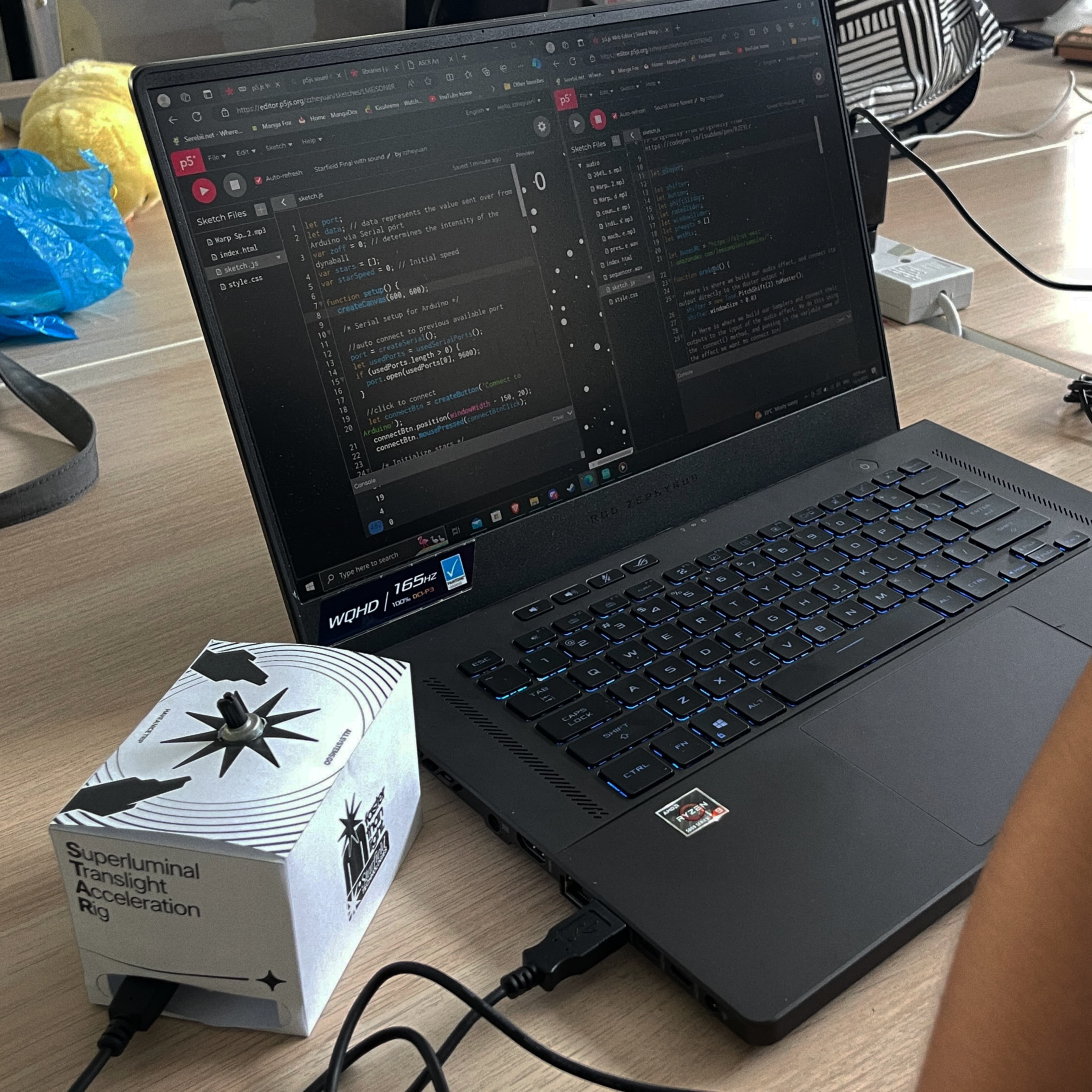 Their crowning achievement was the S.T.A.R. (Superluminal Translight Acceleration Rig). The S.T.A.R project employed Arduino to create a tangible representation of the movement of the cosmos through a p5.js sketch that visualises it, accompanied by a buzzer that imitates the sounds of space. The primary learning objectives of this workshop were to introduce participants to the fundamental concepts of Arduino programming, sensor integration, and data visualisation using p5.js.